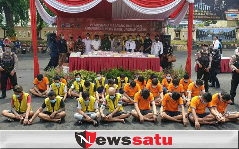 News Satu, Surabaya, Selasa 27 Oktober 2020- Polrestabes Surabaya, Jawa Timur berhasil mengungkap 145 kasus penyalahgunaan narkoba dengan tersangka 194 orang, dengan barang bukti 78 Kg, dan ekstasi 14.791 butir, serta ada Pil Happy Five sebanyak 17.728 butir.